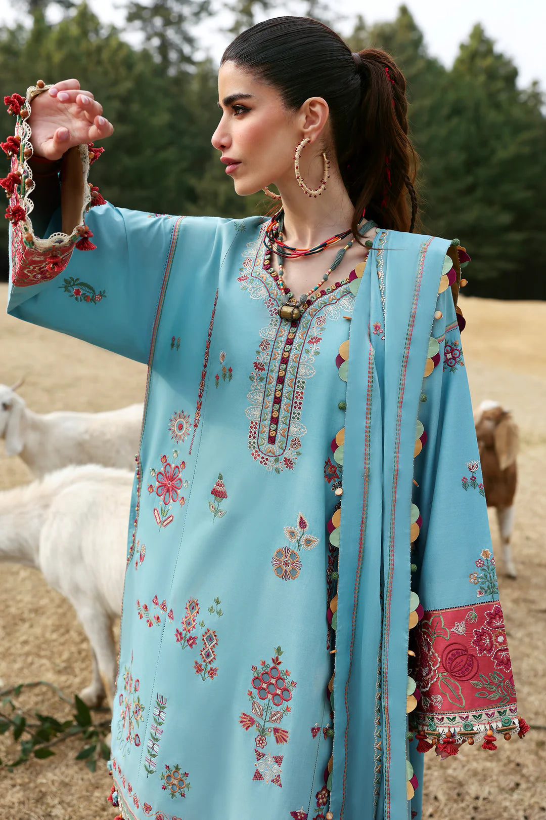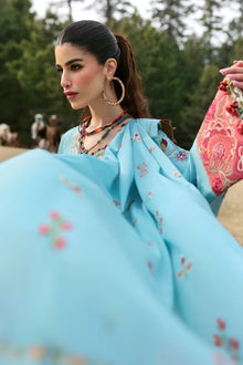 Rhea - Drenched in a mesmerizing ocean blue, this tribal-boho masterpiece is a celebration of artisanal heritage with a contemporary edge. Intricate embroidered motifs in crimson, sage, and brick sprawl across the fabric, creating a rich tapestry of tradition. The bold crimson embroidered patti on the sleeves adds a fiery accent, while delicate laser appliqué work elevates the design with a touch of modern craftsmanship. The tonal voile dupatta, adorned with intricate embroidered motifs, flows effortlessly, perfectly complementing the statement printed trousers. A meticulously embroidered back motif completes the ensemble, making it the ultimate choice for the free-spirited woman who embodies culture, confidence, and effortless elegance.