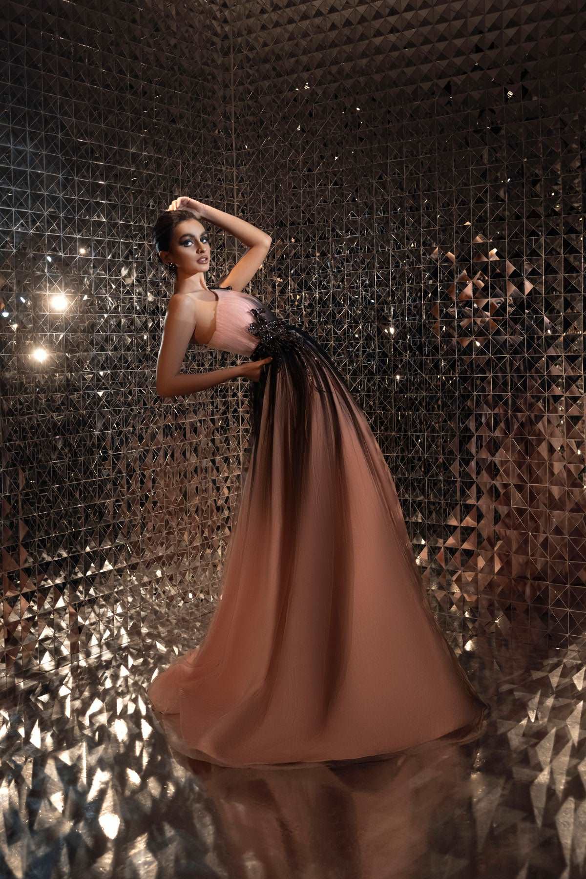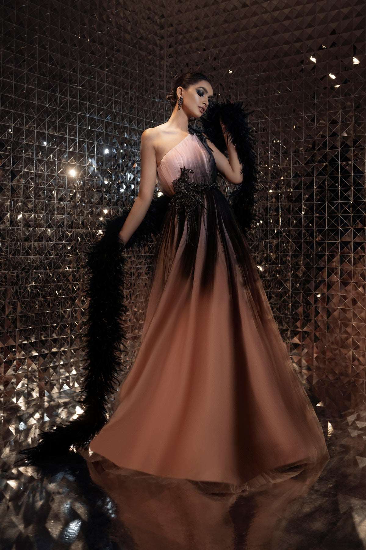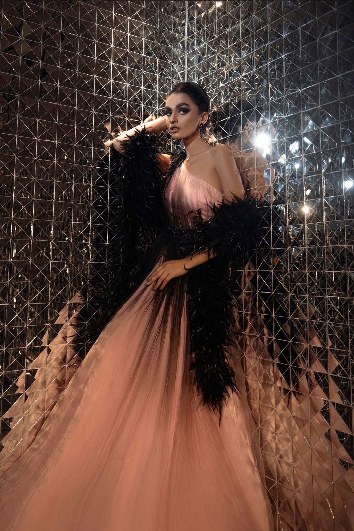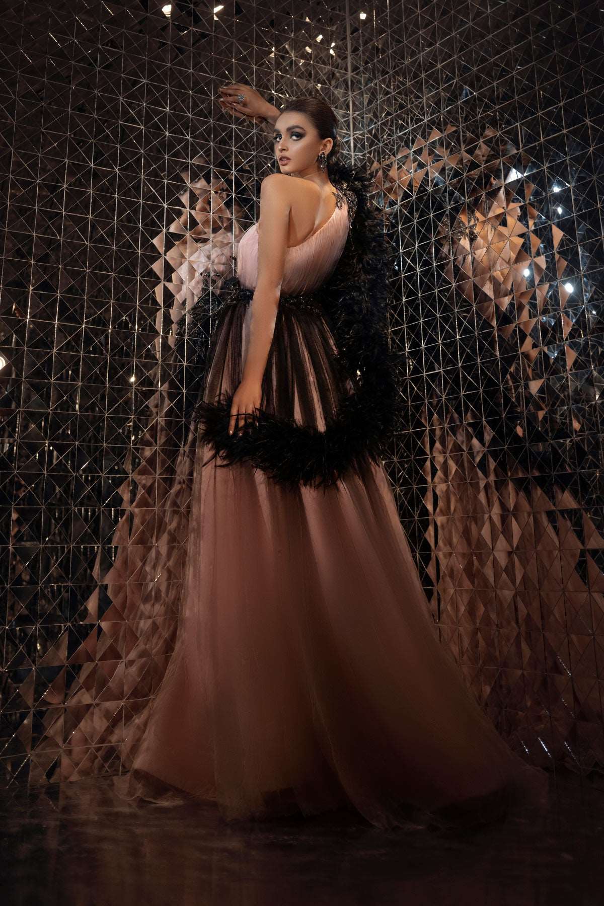 A dreamy silhouette, emblazoned with delicate hand made corsage. Intricately hand worked with glass cut beads. Paired with a hand made feather boa that enhances the strong contrast between the deep black and the subtle pink.