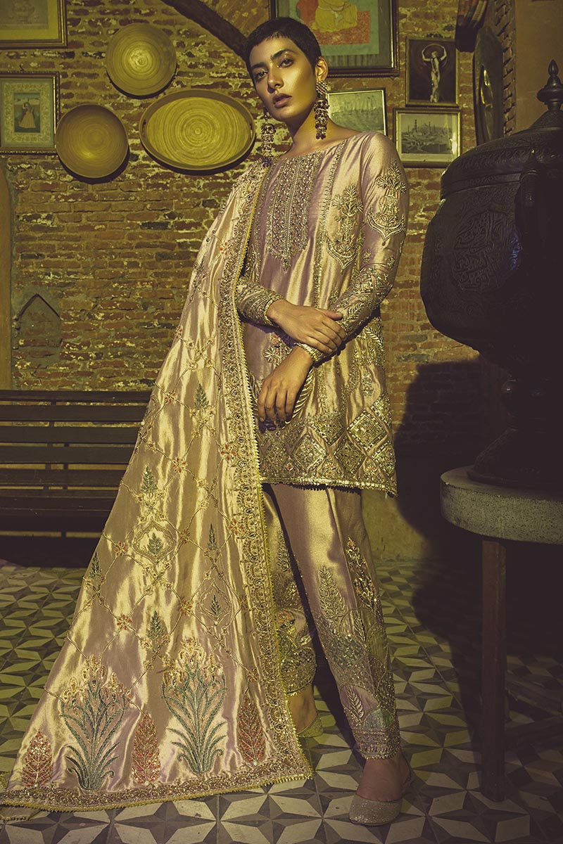 Saahil is set on a rawsilk base. A stunning afghani kurta embellished in the hues of gold and pastels paired with an embellished Kharri shalwaar and a beautiful rawsilk shawl with resham and zarri jaal complete with resham rosettes.