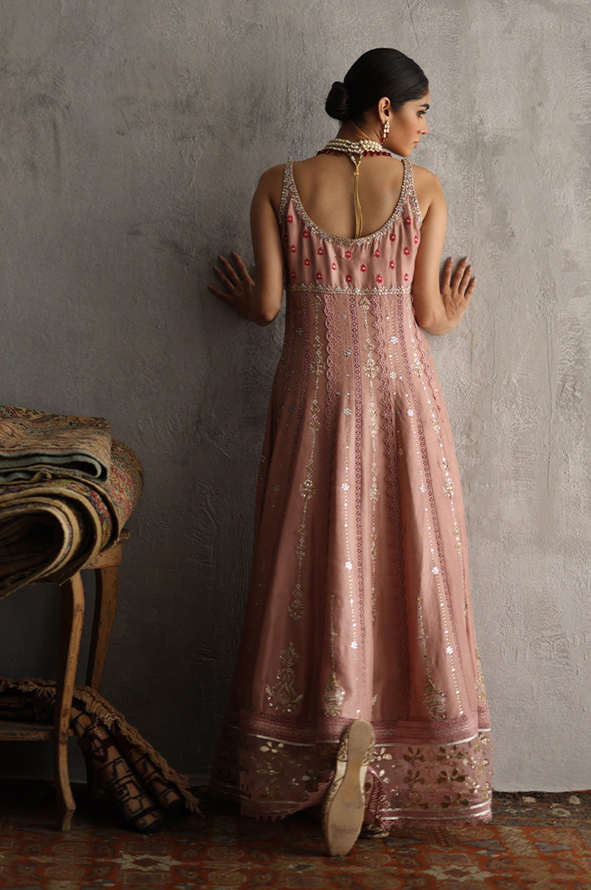 A canvas of intricate and scintillating details, Samsara peshwas redefines royalty. This luxurious raw silk peshwas is intricately hand worked in resham and zardozi on the yoke with kaamdaani along the well defined panels. An all gold gotta border along the ghair bring the outfit together beautifully. Pair it with a sheer organza dupatta with stunning gotta and stitching details for all the festive feels this season!