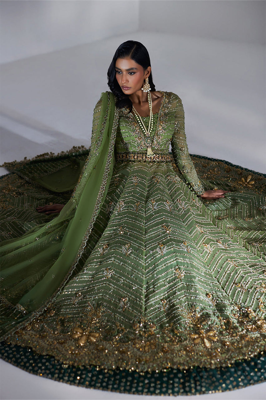 Delve into the epitome of regal allure with the extraordinary 'Scintillant Olive.' This celestial olive green silhouette is a masterpiece of grace and intricacy, adorned with resplendent gold-chrome accents that meticulously showcase elaborate floral patterns. Crafted with impeccable skill and featuring luminous touches of tilla, gotta, kora dabka, and resham, each detail exudes unparalleled luxury. The ensemble is complemented by a delicately hand-embellished zari net dupatta, while the emerald lehenga radiates opulence with its intricate zardosi and luminous pearls, adding a captivating aura of glamour.