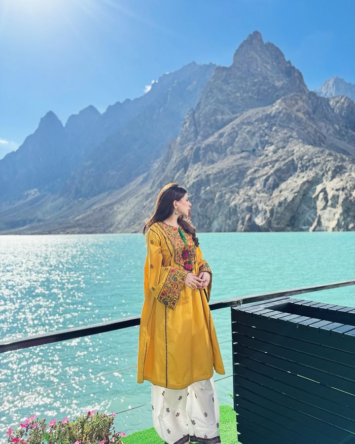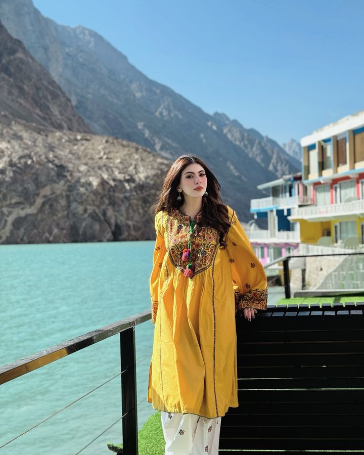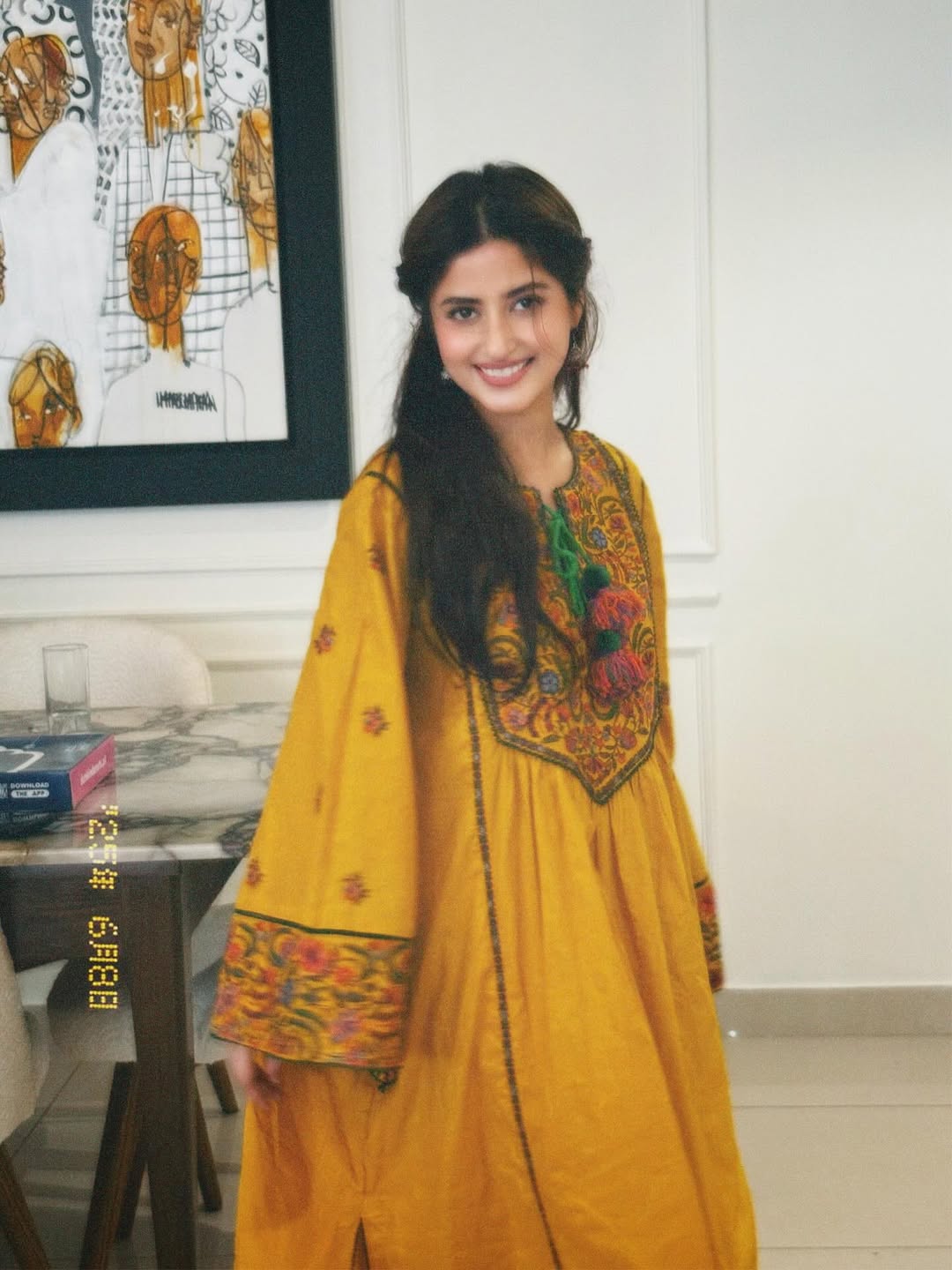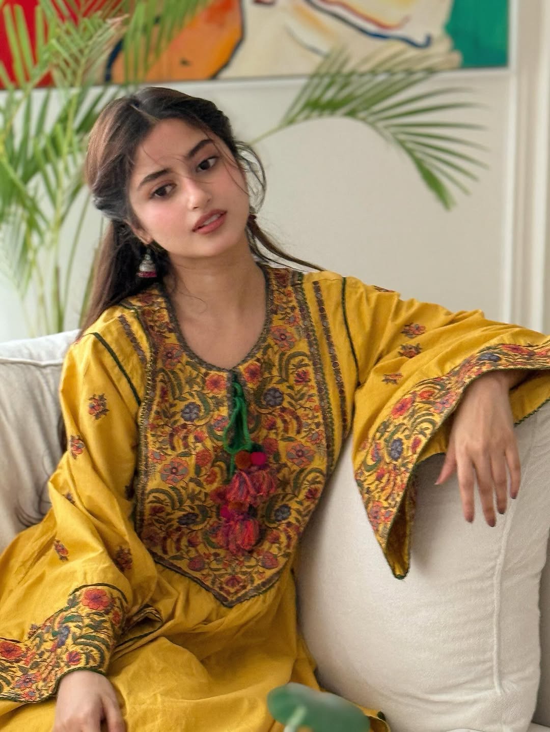 Product Description: Splendor embodies timeless elegance with its mustard A-line shirt featuring a cross-stitch embroidered neckline and sleeves. The intricate embroidery adds a touch of sophistication and artistry to the design, creating a captivating look. Paired with the ivory embroidered flapper shalwar, this ensemble offers a blend of classic charm and modern flair, making it a versatile choice for various occasions. The flowing silhouette of the shirt and the intricate details of the shalwar combine to create a harmonious and stylish outfit that is sure to make a statement.