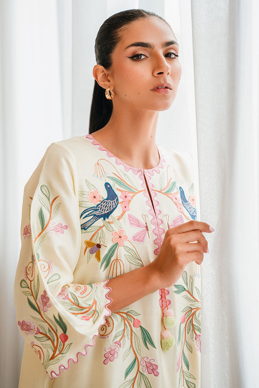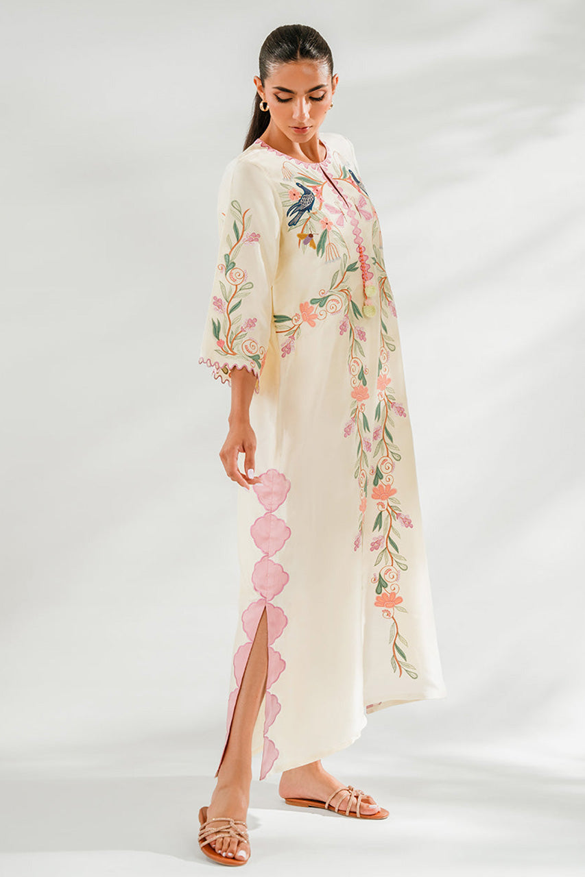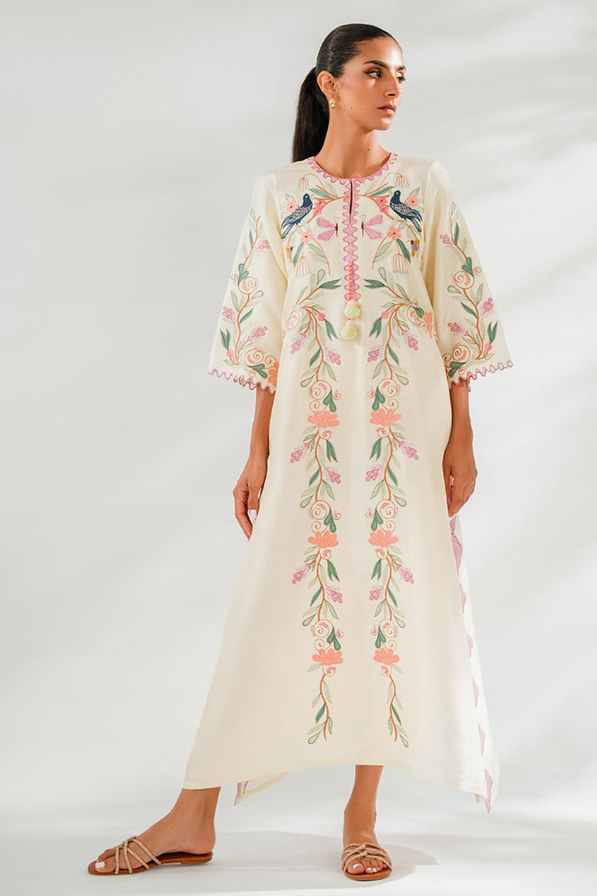 Step into an eggshell kaftan cut from pure rawsilk, featuring expert workmanship. The scalloped sleeves and pale pink applique details on the slits and neckline are paired with quintessential floral embroidery for a scintillating look.