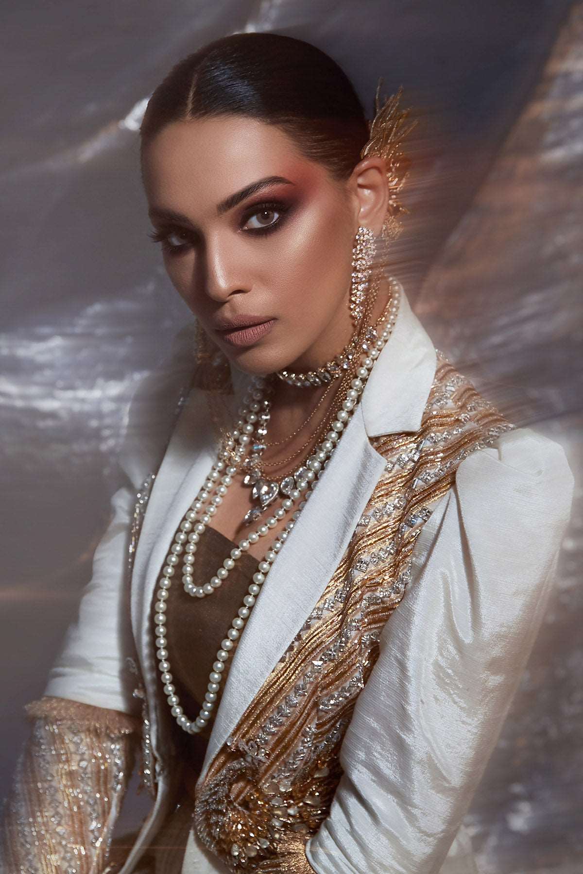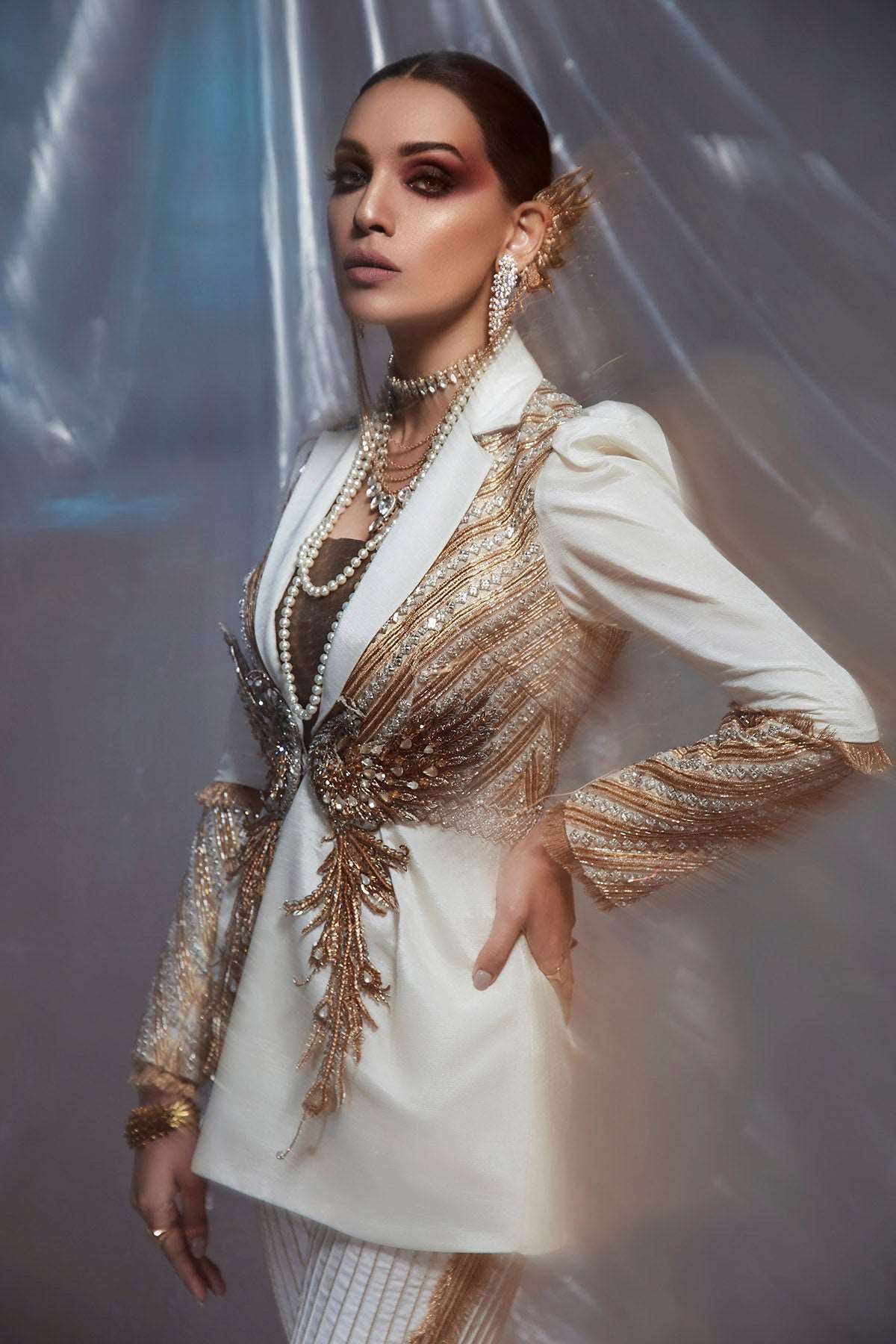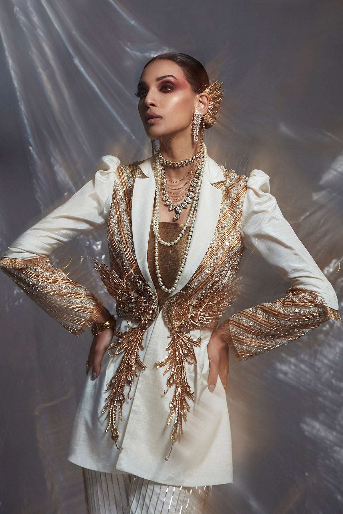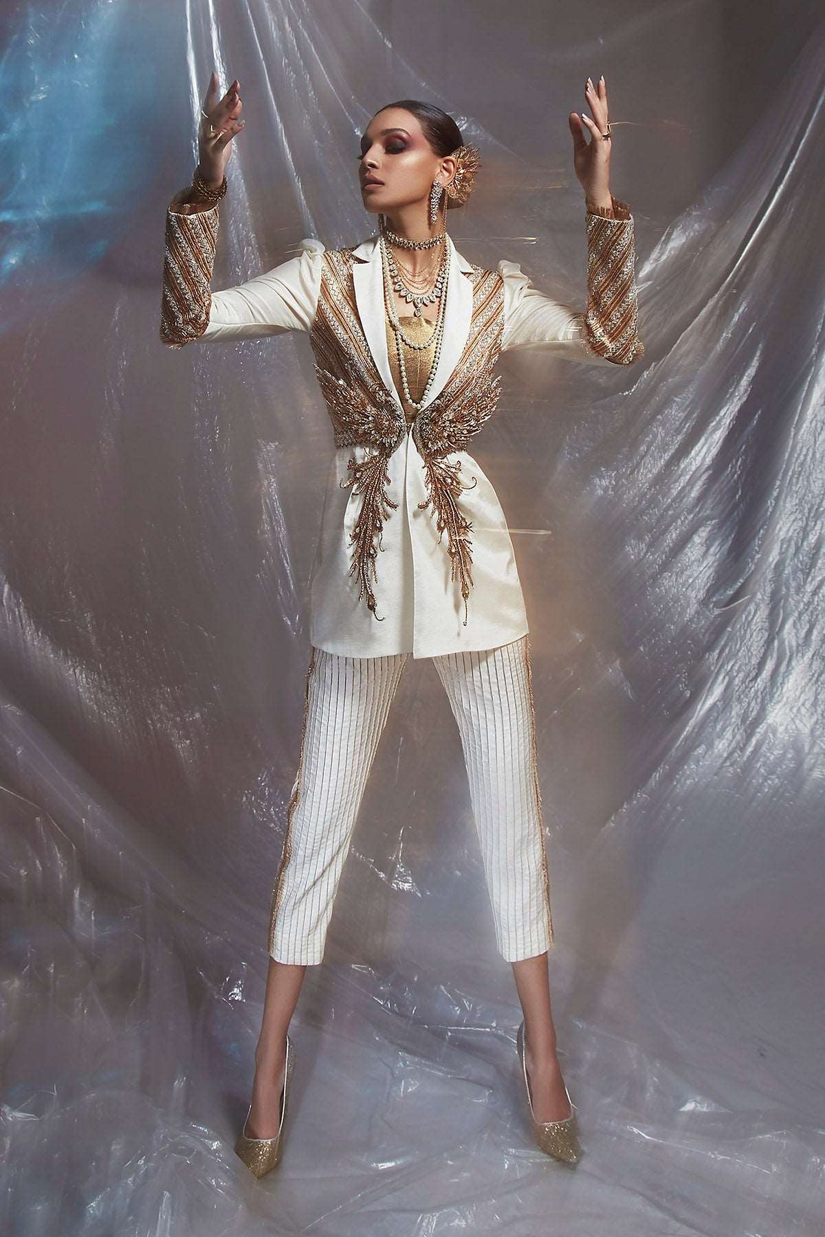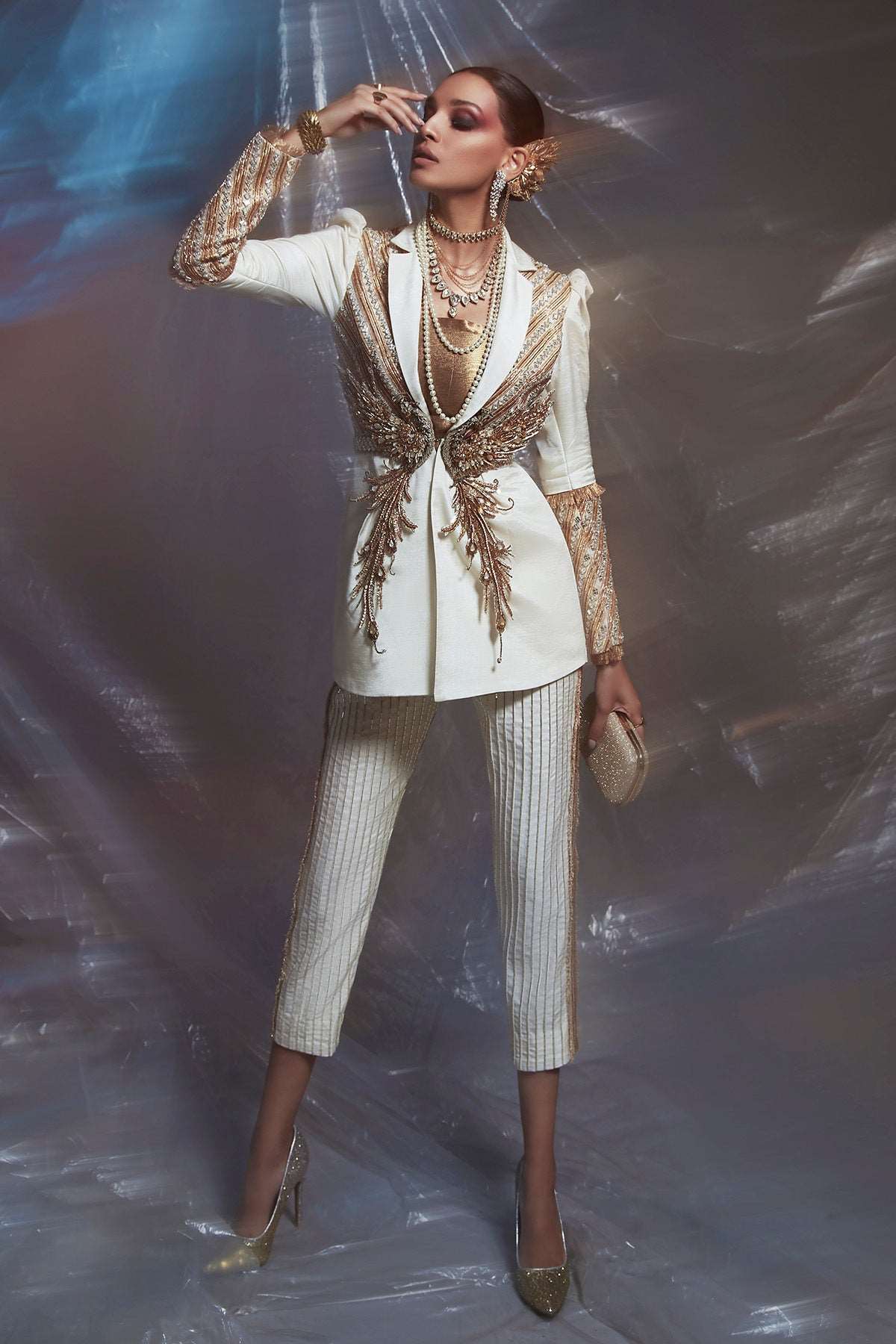 A pearl white jacket with gold sun birds on the sides is hand-crafted with bedazzling princess cut crystals, sensitively shaded sequins and moon glass beads. It is paired with embellished striped trousers laden with moon crystal beads.