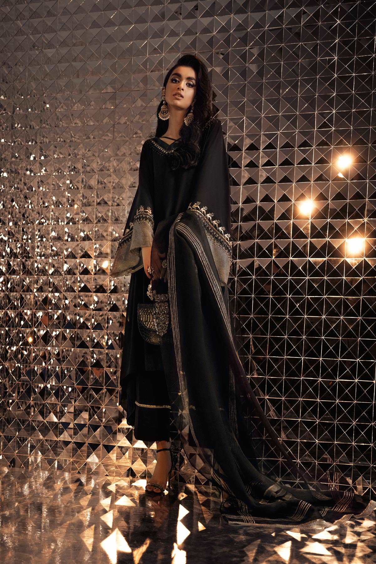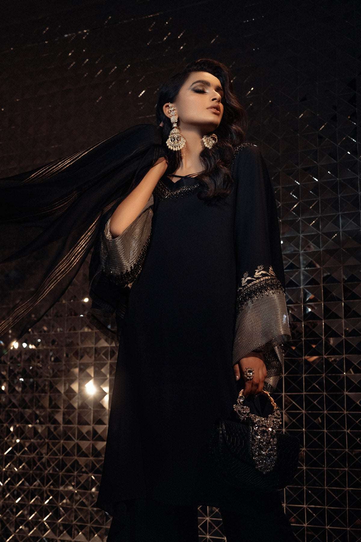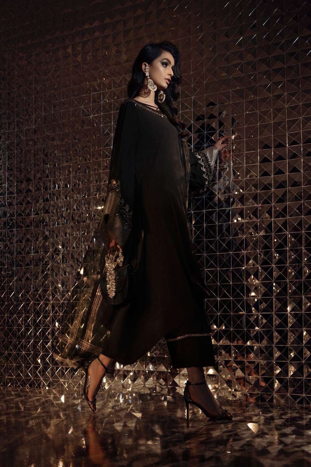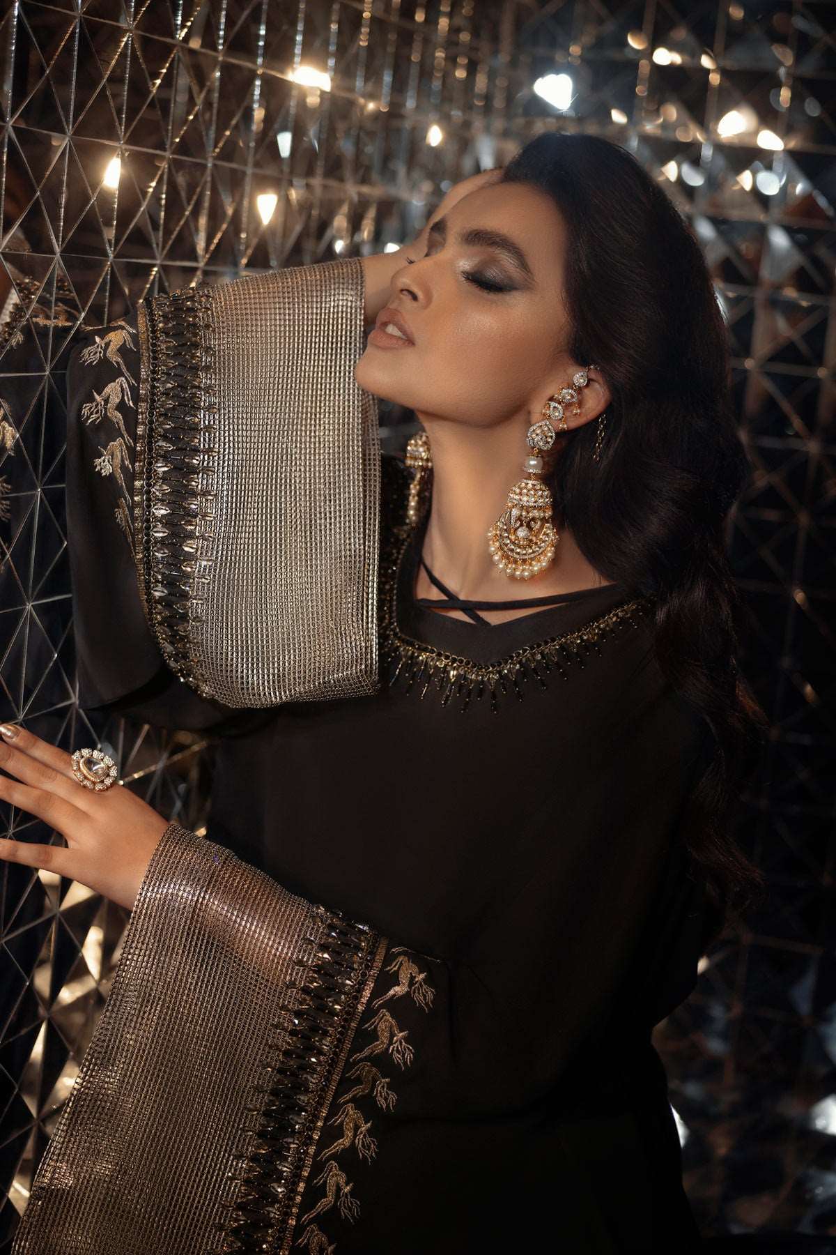 Antique gold and opulent black stone work, travels across the edges of the kurta.
