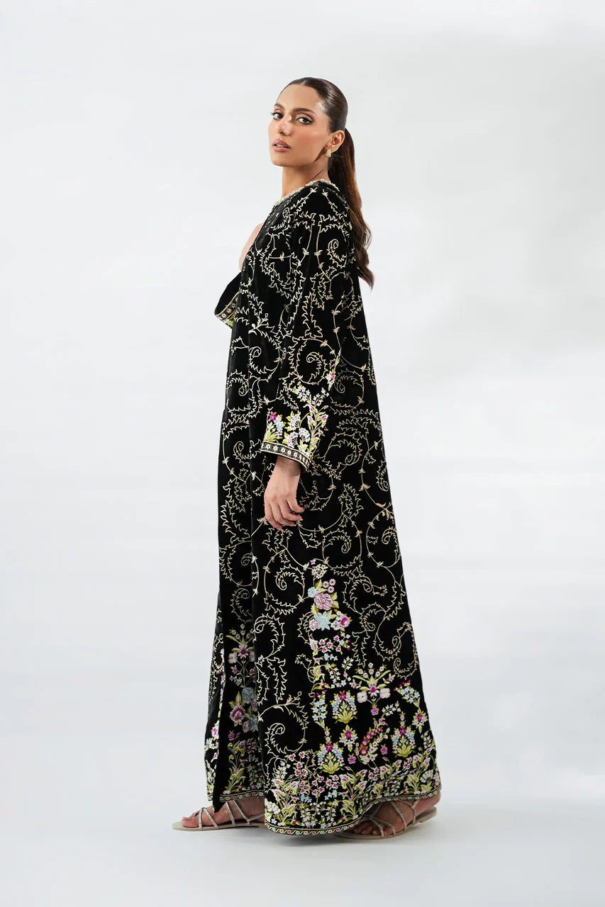 A vision of timeless sophistication, this velvet jacket is adorned with intricate gold thread embroidery in swirling paisley and vine motifs, creating a rich sense of depth and texture. Gemstone-encrusted, necklace-like embellishment adds a touch of radiance, while delicate resham florals in soft lilac, blush, and ivory bloom along the hem and sleeves, infusing subtle color into the plush canvas.