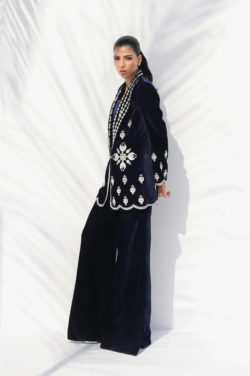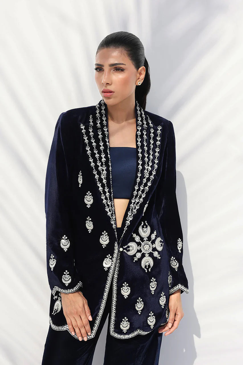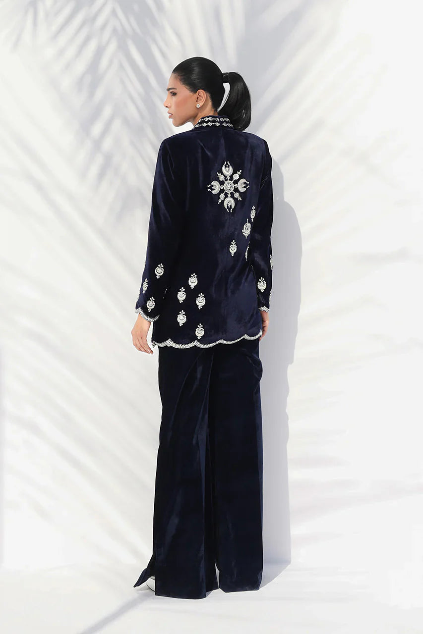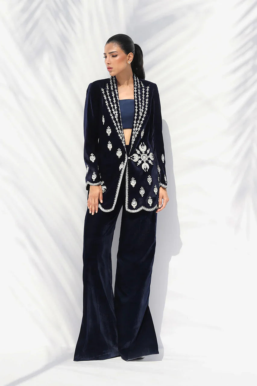 This rich midnight blue velvet ensemble exudes regal elegance, with intricate zardoze embroidery tracing the blazer’s edges and hem in a striking contrast against the deep hue. The jacket’s sharp tailoring defines a structured yet feminine silhouette, paired with a matching charmeuse tube top. The velvet drapes beautifully, complementing the sleek trousers, with a side slit, for a seamless fusion of contemporary tailoring and classic detailing.