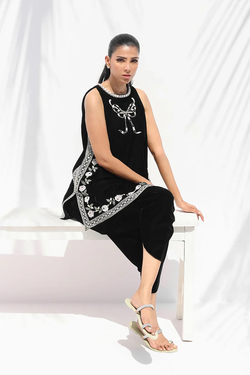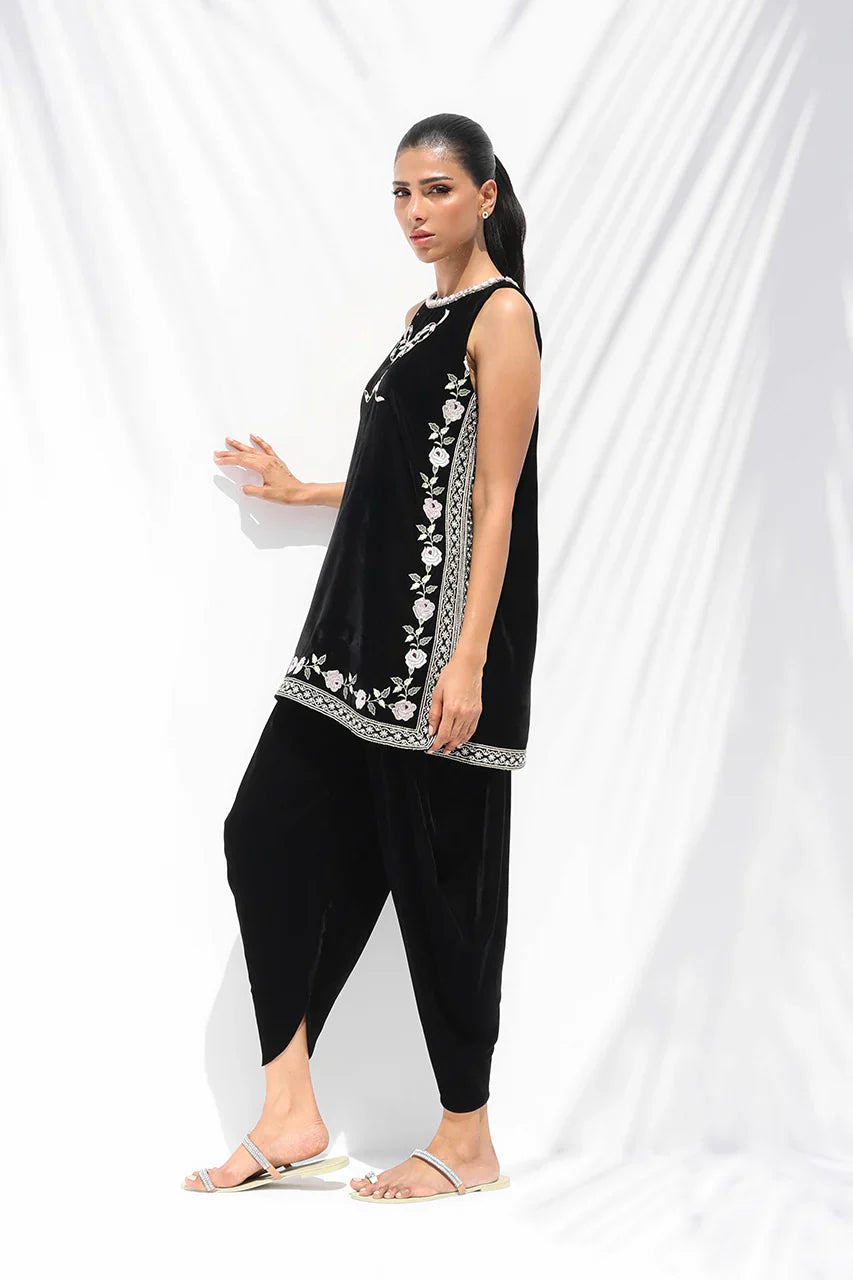 A vision of contemporary elegance, this ebony velvet shirt is tailored in a sleeveless A-line silhouette. Delicate embroidery adorns the neckline with a bow motif and traces the borders in soft floral vines. Paired with a velvet balloon shalwar that balances fluidity and structure, the look is finished with a pearl and diamante edged neckline, embodying modern glamour.