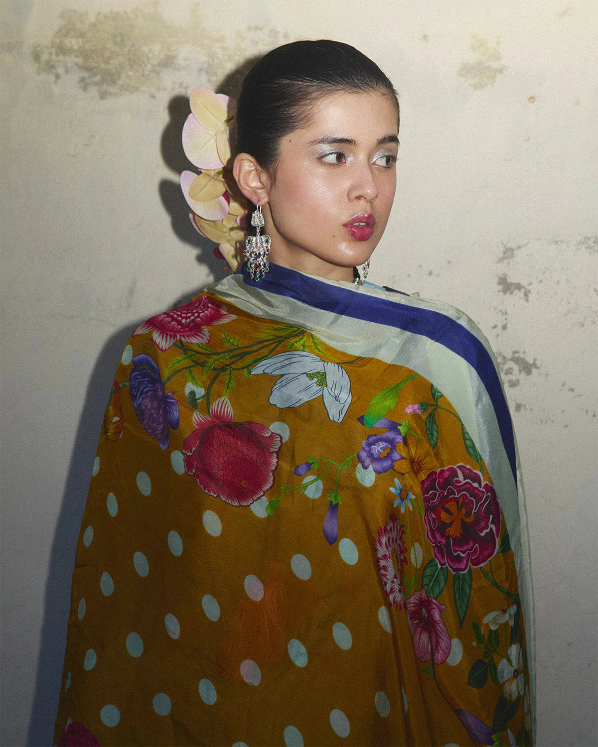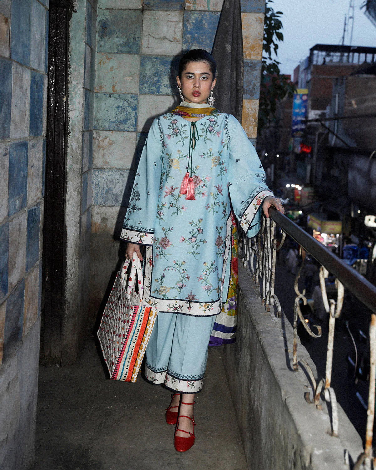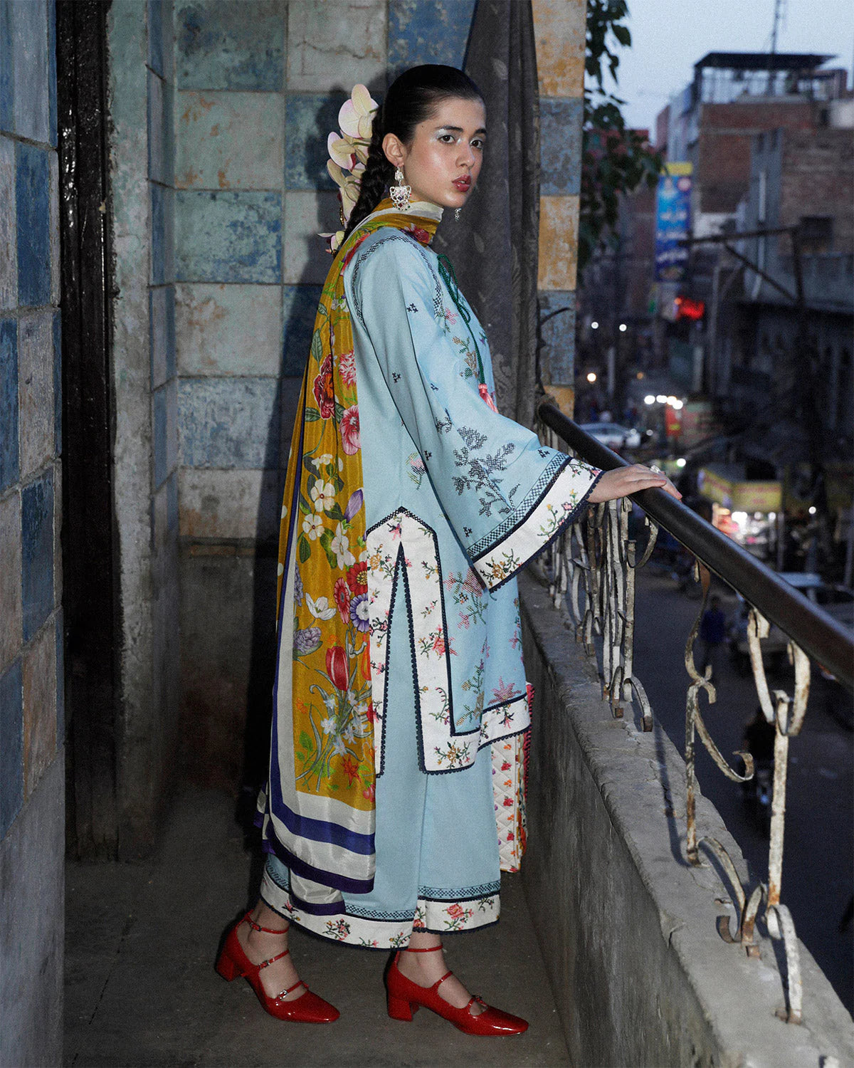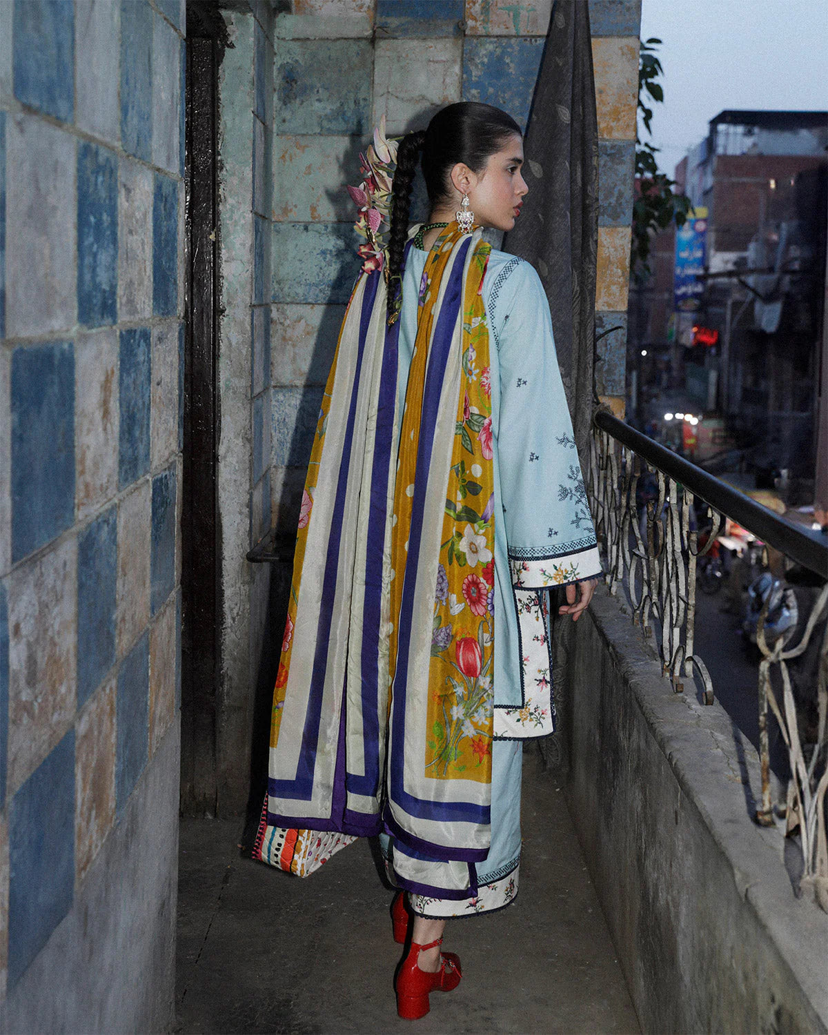 Product Description: Step into serene elegance with the Tranquil, the sky blue burta features vibrant multicolored cross-stitch embroidery, harmoniously complemented by embroidered ivory color block panels on the sleeves and hem. Paired seamlessly with sky blue culottes adorned with matching ivory color block panels on the hem, and accompanied by a mustard printed silk dupatta, this ensemble exudes a peaceful charm and artistic sophistication.