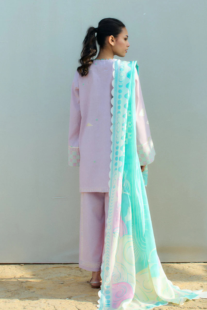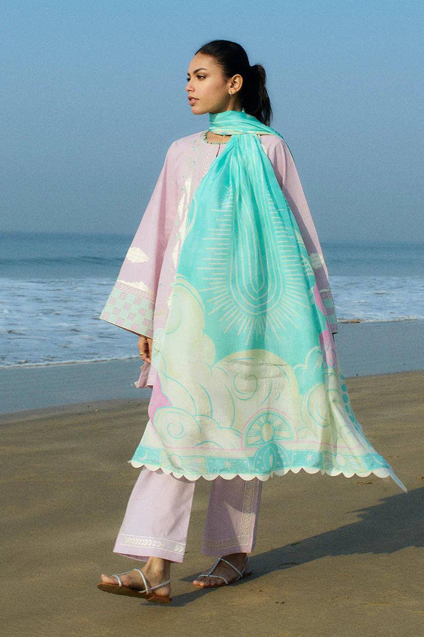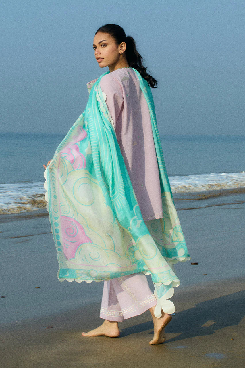 An elegant mix of resham and applique embroidery adorns a lilac hued jacquard lawn shirt and culottes. A floral bouquet in the most subtle hues of ivory and moss green is embellished on the hem with checkered ice blue applique elevating the sleeves. Paired with an ice blue pure medium silk dupatta featuring an ethereal print in shades of pastel.