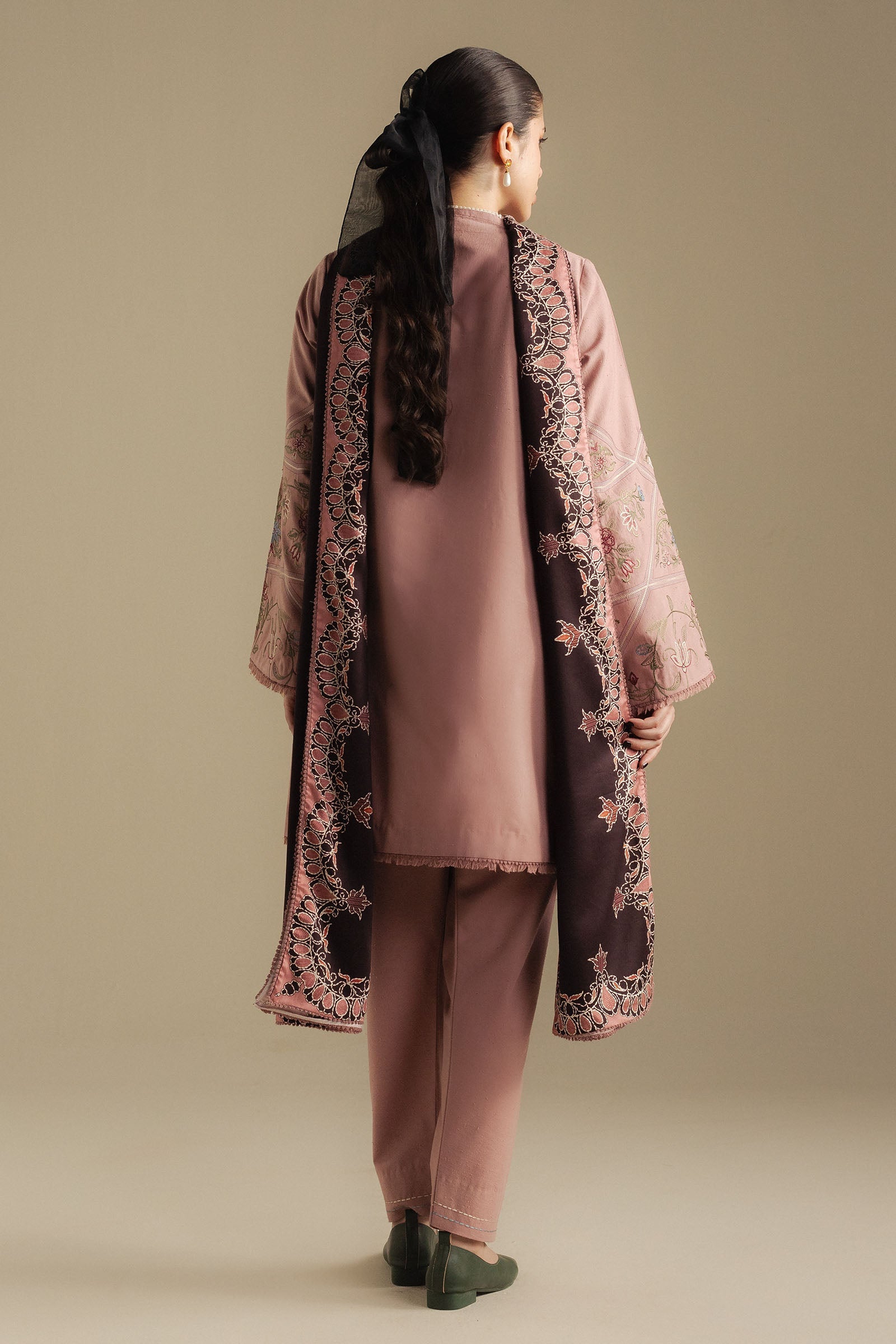 A blush pink karandi shirt and trouser paired with a deep brown and candle light peach shawl, a warm yet delicate mix that carries effortless winter charm.